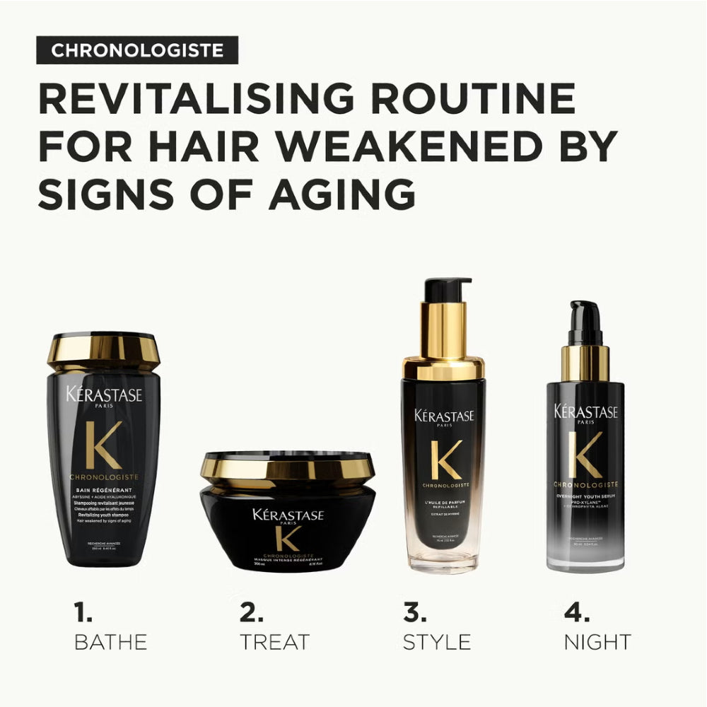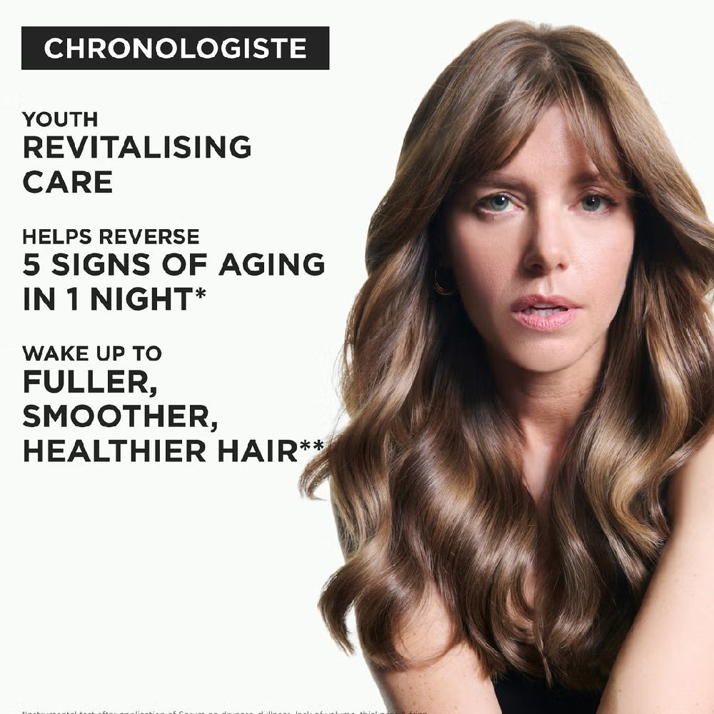 Den nya Chronologiste har en målinriktad behandling som synbart förbättrar fem nyckeltecken på åldrande hår: frissighet, torrhet, matthet, brist på tjocklek och brist på volym.