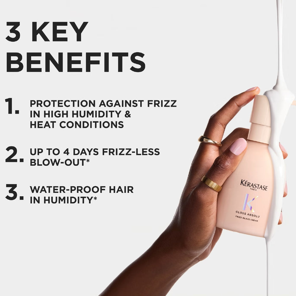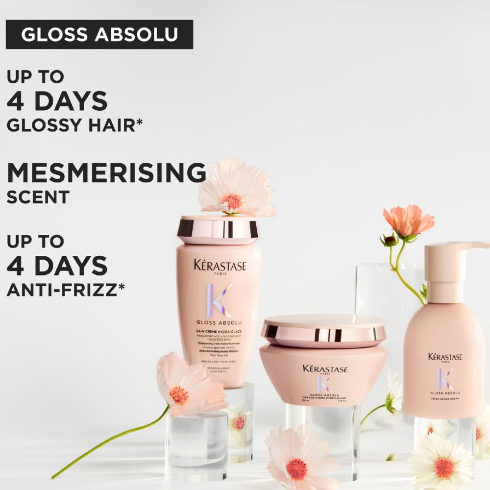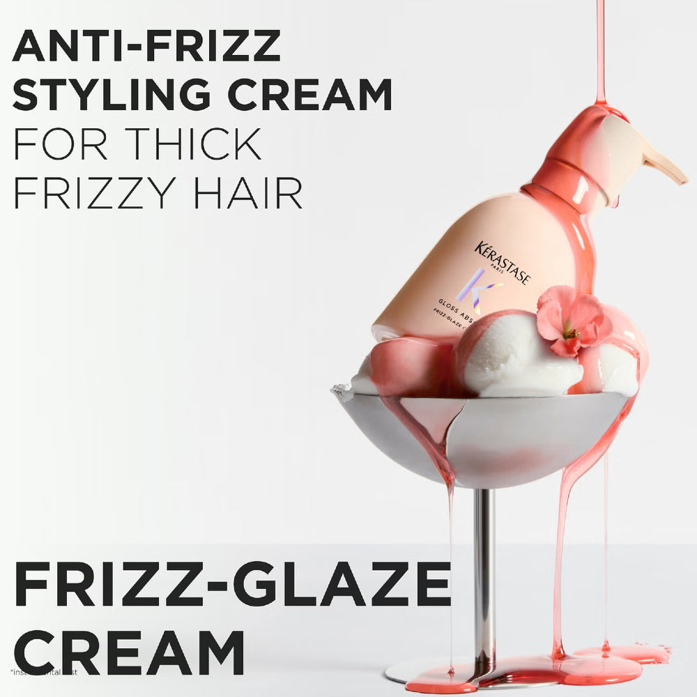 Gloss Absolu Frizz-Glaze Cream är en leave-in-stylingkräm för tjock, frissigt hår som kräver djupgående näring och extra friss-kontroll. Resultatet är ett skinande, återfuktat, spänstigt och glansigt hår, med motverkning av friss i upp till 4 dagar. Den krämiga och rika formulan skyddar håret från friss, även i de mest luftfuktiga och varma förhållanden, och skyddar håret från vatten i upp till 98% luftfuktighet. Formulan innehåller Hyaluronsyra, Glykolsyra och Vildrosolja, såväl som nyckelingredienserna Glycerin Sojaprotein och Ricinolja.