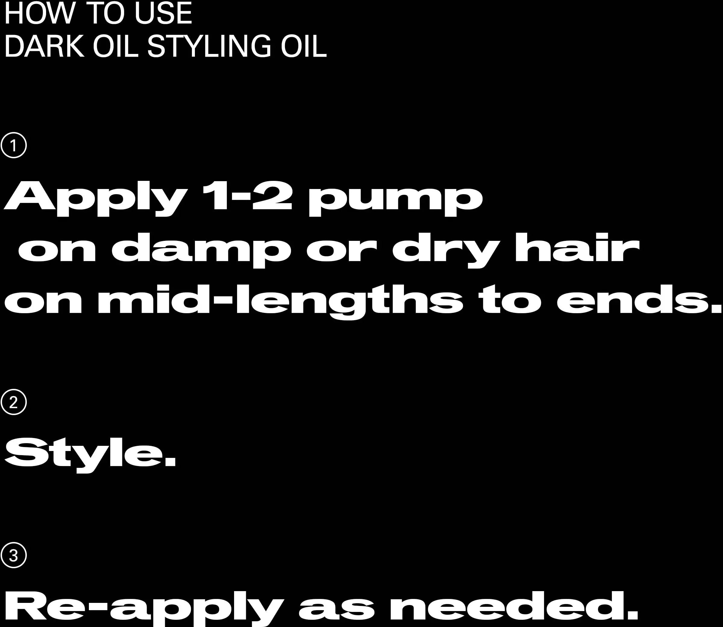 För ett slätt och glänsande resultat, applicera 1–2 pump av Sebastian Dark Oil i längder och toppar på fuktigt eller torrt hår innan styling.